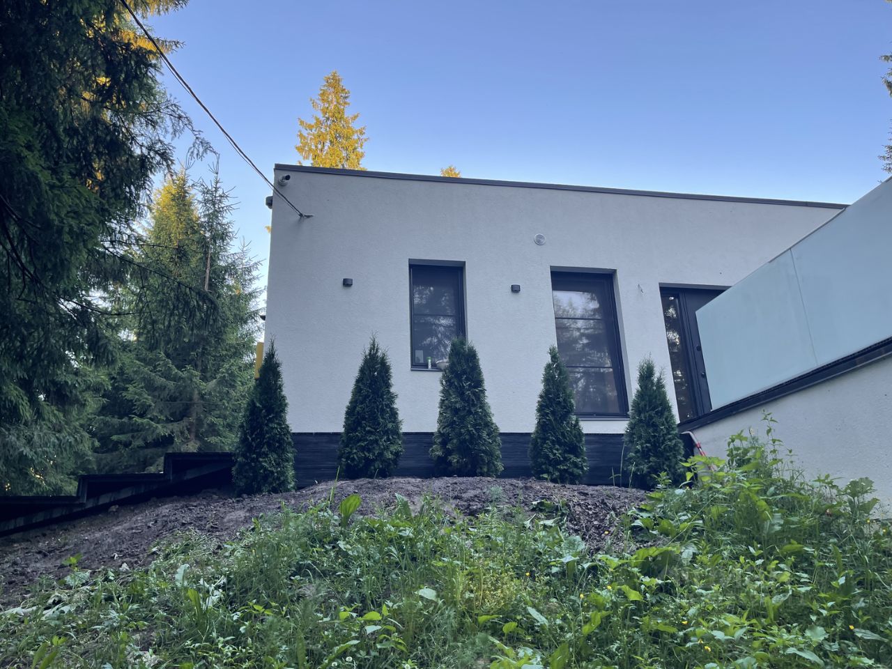 Дом выполнен в современном стиле с плоской кровлей и эксплуатируемой террасой на кровле гаража. Баня-беседка 30м2 на заднем дворе. Внутри имеется вся необходимая техника и мебель для проживания (вся мебель остается новым хозяевам). Потолки высокие- 3м, дорогие панорамные окна Veka Spectral, скрытые карнизы.