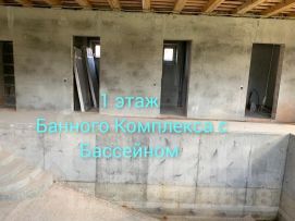 1 На первом этаже бани площадью 153 квадратных метра расположен бассейн размером 8 на 4 метра с плавным перепадом глубины до 3,1 метров и возможностью установки противотока. Глубина подушки котлована, служащей фундаментом для бассейна, составляет 400 миллиметров. Стены выполнены из монолитного железобетона толщиной 300 миллиметров.