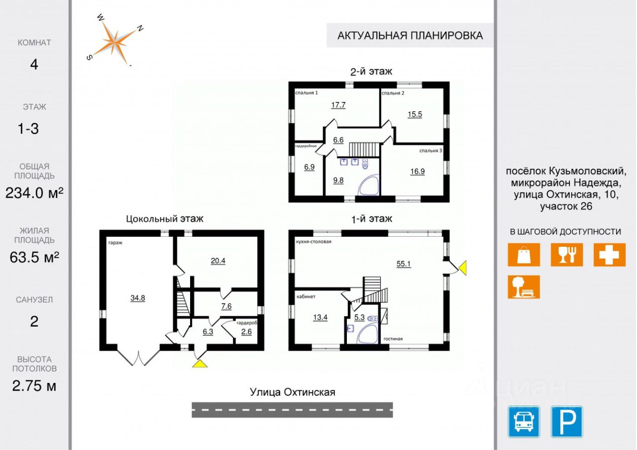 На цокольном этаже расположен отапливаемый гараж, техническое помещение для хранения садового инвентаря, гардеробная и котельная с функциональным оборудованием. На первом этаже предусмотрена большая кухня-гостиная с действующим камином( м2) и панорамным остеклением, кабинет и санузел.