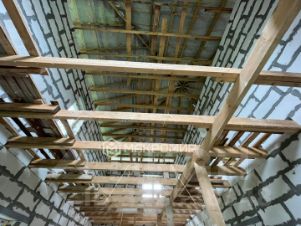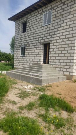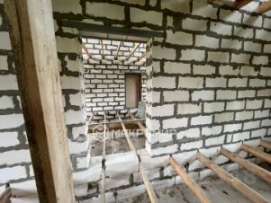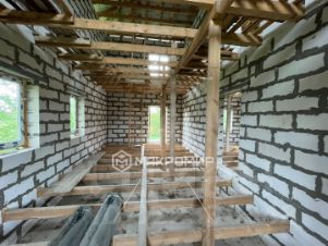 Дом построен из газобетона, ленточный фундамент, установлены двери и окна.