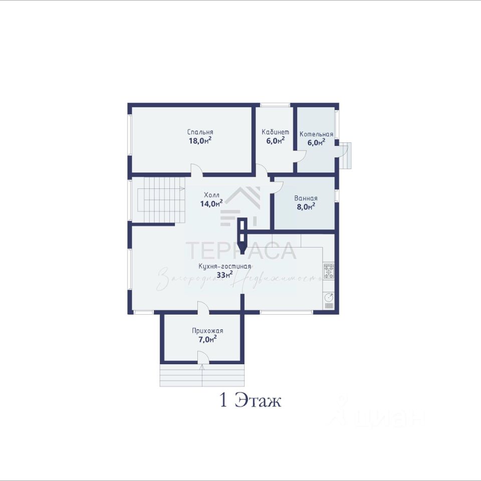 1 этаж - гостиная, кухня, спальня, кабинет, прихожая, котельная, с/у.