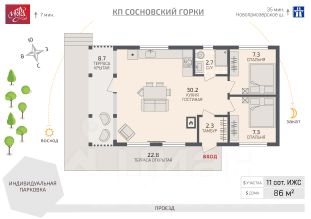 * Планировка: 2 спальни, кухня-гостиная с выходом на террасу, санузел, прихожая.