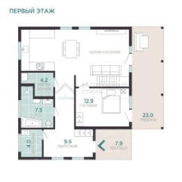На первом этаже - просторная кухня-гостиная с выходом на террасу, отдельная спальня, санузел с ванной и душем, постирочная-кладовая и котельная.