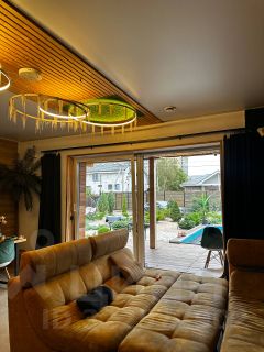 — просторая гостиная с панорамными окнами с шикарными видами на участок и на бассейн, большим ТВ и PlayStation 4;