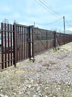 Участок — ровный, сухой. Забор из металлоштакетника с откатными воротами.