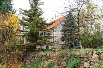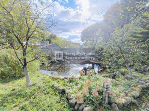 Участок разноуровневый, зелёный, с садовыми деревьями и прудом с рыбой.