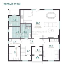 Первый этаж: просторная кухня-гостиная с выходом на террасу, спальня, санузел, сауна, гардеробная, постирочная, хозяйственная комната и котельная.