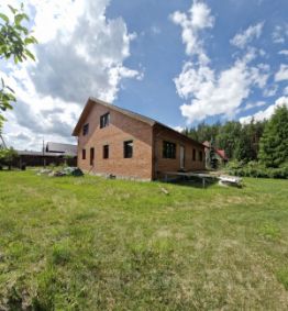 На текущий момент, на выровненном высоком участке возведен двухэтажный дом из оцилиндрованного бревна и бруса, фасад выполнен из красного кирпича.