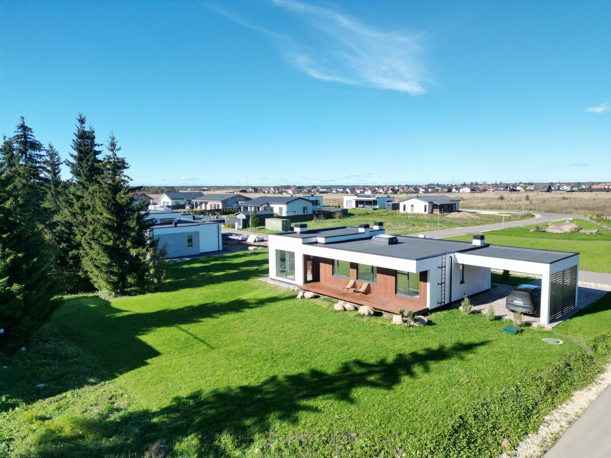 Мастер-спальня + 3 спальни, большая кухня-гостиная, 2 санузла, гардеробная, тех. помещение, навес для 2 авто и терраса.