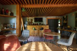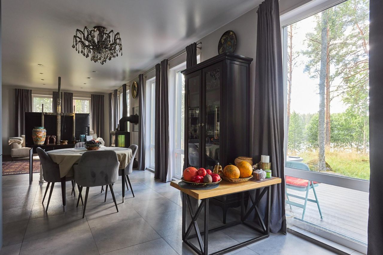 Светлая и просторная кухня-гостиная с камином из которой предусмотрен выход на открытую террасу с потрясающим видом на озеро идеальное место для семейных вечеров и встреч с друзьями.