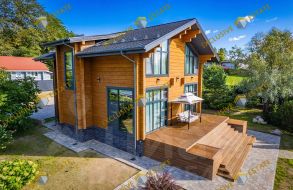 Фундамент - ж/б плита 200 мм, стены из клеёного бруса 240*270, перегородки каркасные, кровля - мягкая черепица по обрешеткам и деревянным стропилам с устройством наружной организованной водосточной системой