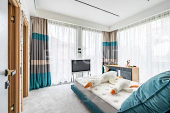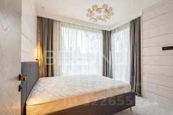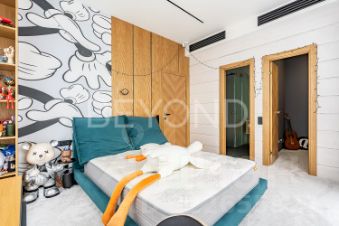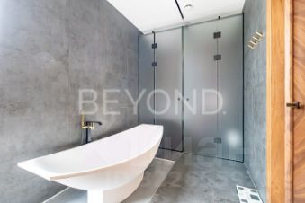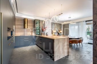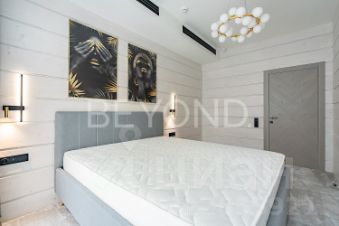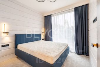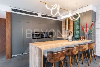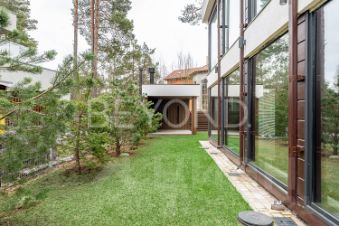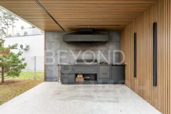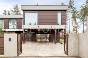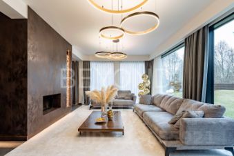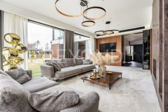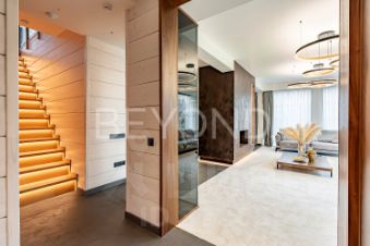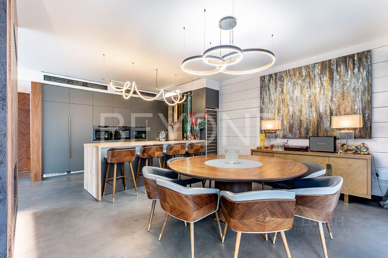 Внутри дома вас поразит изысканный интерьер с использованием натурального шпона американского ореха, микробетона с подогревом и премиального ковролина. Вся мебель выполнена на заказ, а встроенная техника ASKO, Liebherr, OMOIKIRI и DUNAVOX подчеркивает высокий статус этого дома.