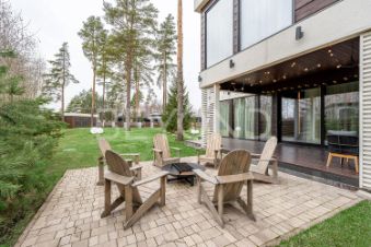 На участке выполнен ландшафтный дизайн, рулонный газон с автополивом и плодовые деревья. А для владельцев электромобилей предусмотрена зарядная станция мощностью 7 кВт.