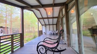 - Шикарная терраса с прекрасным видом на участок и баню, идеальное место для семейных посиделок и отдыха.