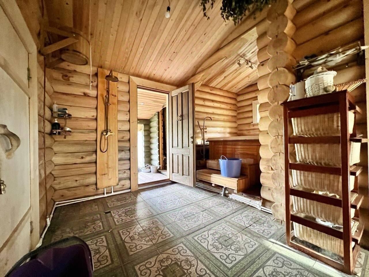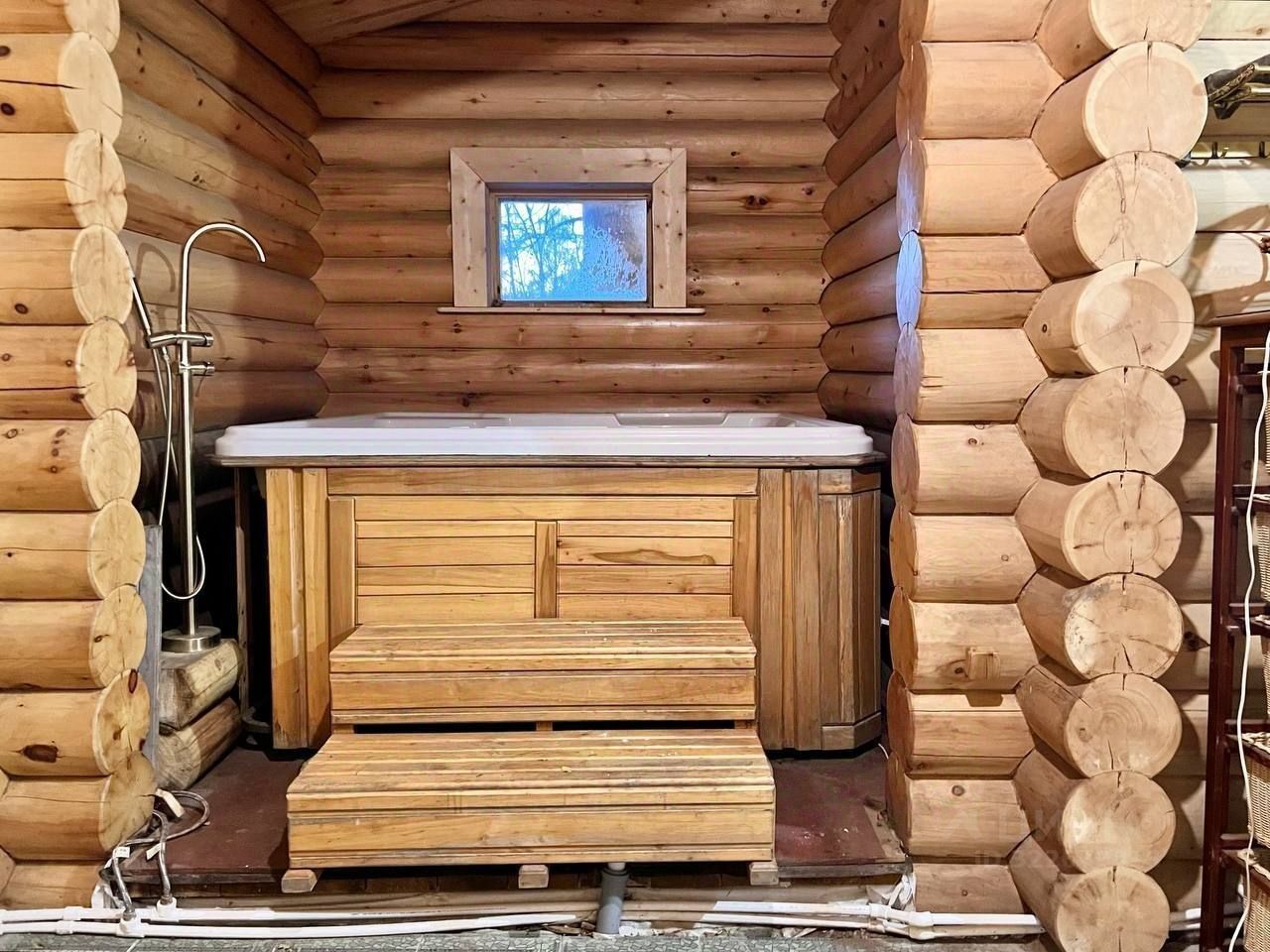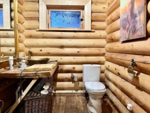 Дом(банный комплекс) построен по индивидуальному проекту из брёвен сибирского кедра, одноэтажный, с парной (полки из сосны кело), душем, джакузи, с частично травяной кровлей, панорамным остеклением, в комнате отдыха сделана печь-камин.