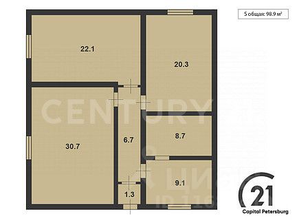 В доме три большие жилые комнаты (22,1+30,7+20,3) кв.м, кухня 9,1 кв.м