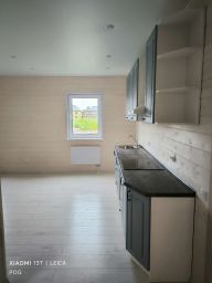Отделка чистовая: снаружи фасадные панели, имитация под камень; стены внутри имитация бруса; полы ламинат, потолки натяжные с встроенными светильниками.