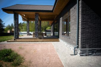фасады White Hills Остия Брик 383-80, колонны на террасе и цоколь фундамента White Hills Кросс Фелл 109-80.