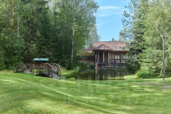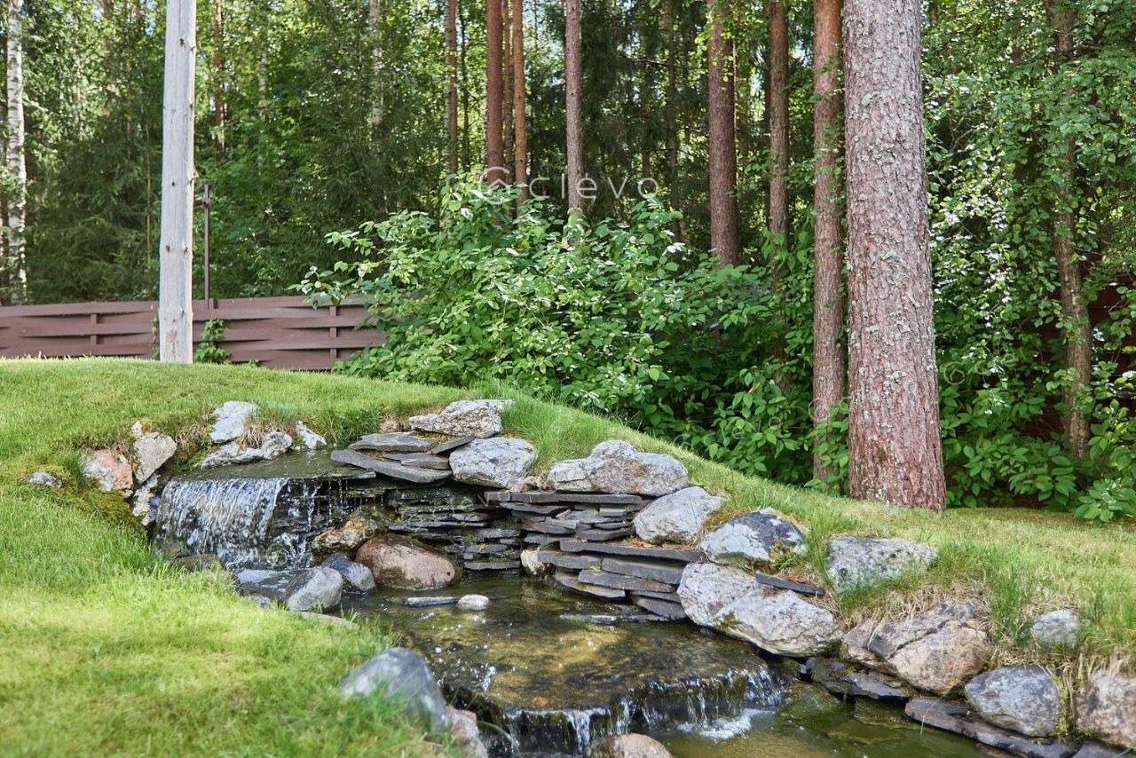 Перед домом раскинулась просторная площадка для встреч и отдыха, а также уютная полянка с идеально ухоженным газоном. В непосредственной близости — лужайка с ручьем, водопадом и прудом, где живут сотни рыб. В глубокой части пруда можно купаться — глубина около двух метров, что создает ощущение настоящего природного спа.