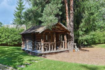 На северной стороне участка расположен гостевой дом для гостей или персонала, а в восточной части — вековая сосна диаметром более метра, окруженная плодовыми деревьями и кустарниками, создающими атмосферу уединения и уюта.