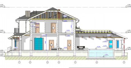 Двухэтажный дом, общей площадью 323 кв.м. с бассейном и сауной, на участке 21 сотка + гараж. Имеется проект дома.
