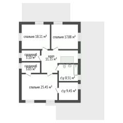 На втором этаже находятся мастер-спальня (25,4 м²) с собственным санузлом (9,4 м²) и гардеробной (5 м²), а также две детские комнаты (17,8 м² и 18,1 м²) и общий санузел (8 м²).