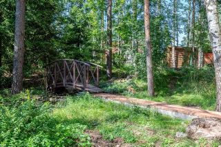 Участок с ландшафтным дизайном, на котором каскадный ручей и декоративный пруд.Вековые дубы, липы, сосны и берёзы.