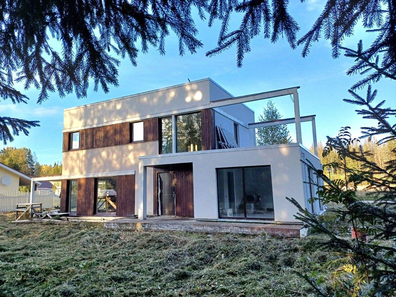 - Современная планировка. Кухня-гостинная 41 м2 с панорамными окнами на лес и выходом на террасу. Второй свет. Жилая комната на 1 этаже 27 м2 с входом на террасу. На 2 этаже спальня 11,5 м2 и мастер-спальня 11,5 с видом на лес и выходом на балкон. Санузел на 1 этаже и помещение по санузел/сауну на 2 этаже. Кладовая. Балкон 29 м2.