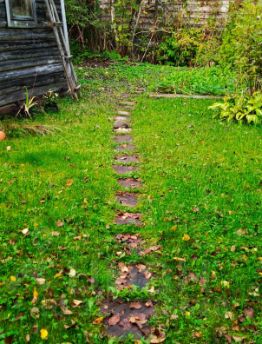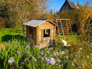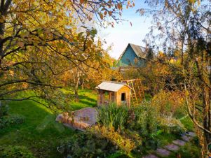 На участке - яблони, сливы, смородина.