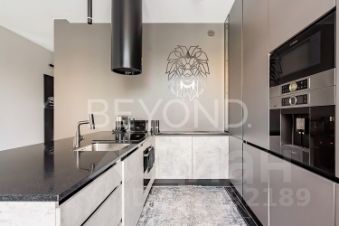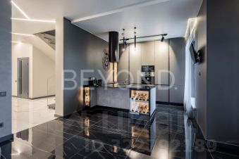 Дом полностью меблирован и готов для постоянного проживания. На первом этаже располагаются: гардеробная при входе, гостевой санузел, единое пространство кухни-гостиной с камином и выходом на террасу. Кухня оборудована современной бытовой техникой, вся мебель изготовлена на заказ.