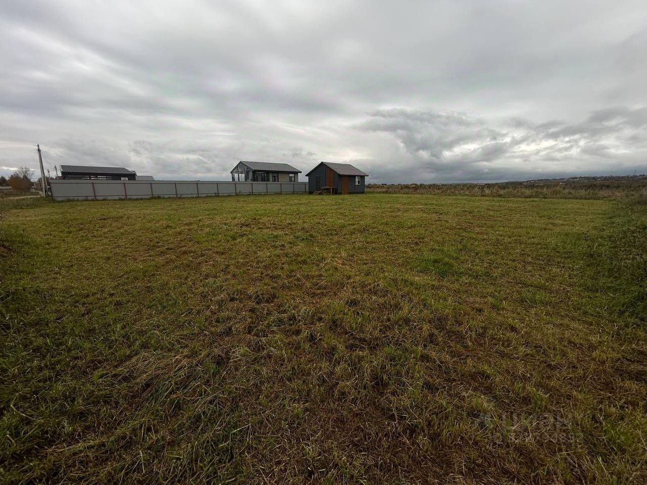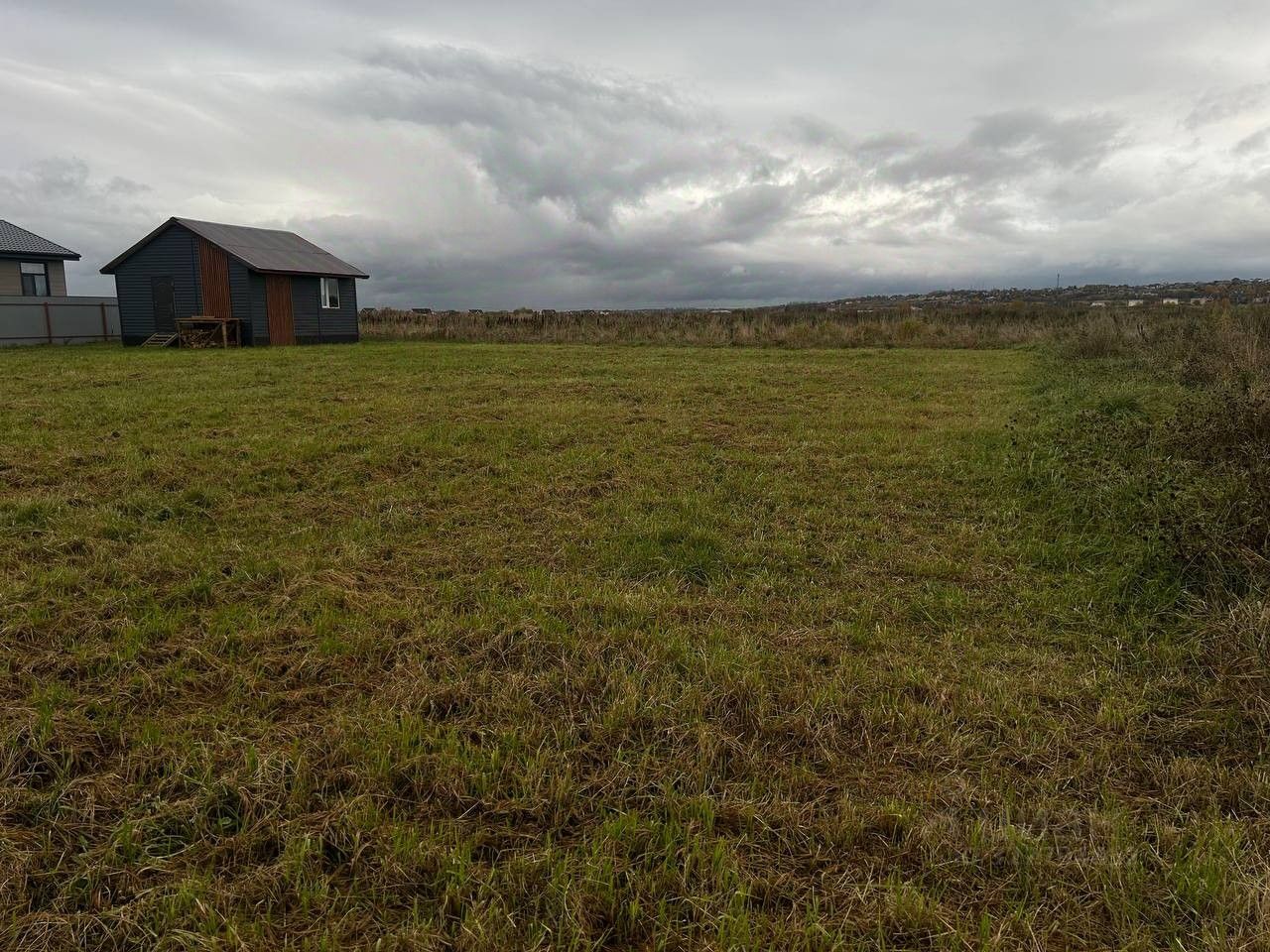 Участок с красивым панорамным видом на лес и луга с одной стороны, и коттеджный поселок вдали с другой стороны.