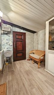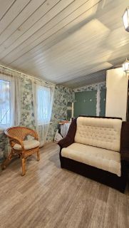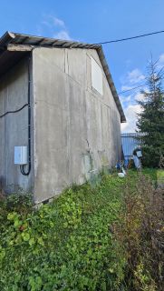 На участке есть строение (каркасный дом на фундаменте), с одной стороны у которого гараж (30 кв. м.) а с другой - жилое помещение (56 кв.м.), состоящее из двух комнат (16 и 12 кв. м.), утепленной веранды (11 кв.м.), небольшой кухонной зоны , санузла и прихожей. Заведена вода, есть бойлер, электрический котел. Подходит для круглогодичного проживания.
