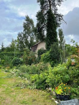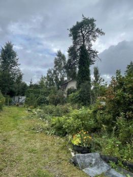 Участок прямоугольной конфигурации, обильно озеленен, имеются фруктовые деревья. На участке располагается беседка, хоз. строение. Въезд оборудован, ограждение имеется.
