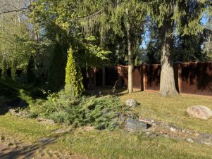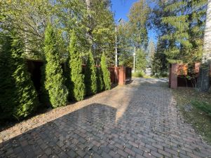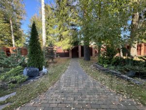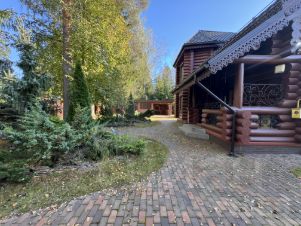 На участке сделан ландшафтный дизайн, растут высокие сосны и голубые ели. Есть беседка из кирпича с зоной барбекю и печью для пиццы, отдельная котельная на баню и хозяйственный домик для хранения инвентаря.
