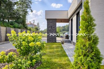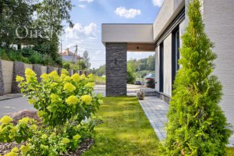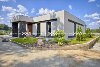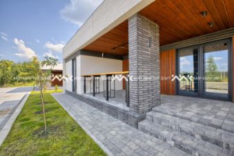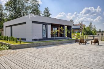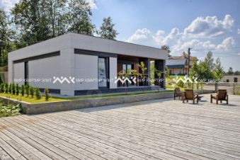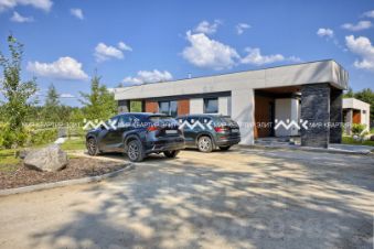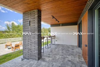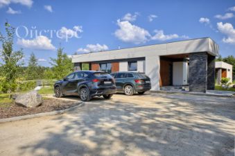 Прочная металлическая двускатная кровля (угол наклона 5) гарантирует эффективную защиту от дождя и неблагоприятных погодных условий. Для облицовки фасада применены качественные японские фиброцементные панели и планкен, придающие зданию современный и респектабельный вид.