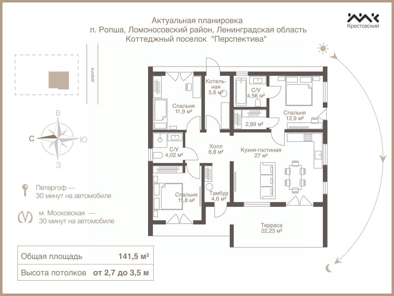 Расположение удобное. 2 км до Ропши, 14 км до Красного Села и 15 км до КАД. Всего 40 минут до центра Санкт-Петербурга даже в час пик. Вся необходимая инфраструктура рядом: школы, детские сады, магазины и многое другое.