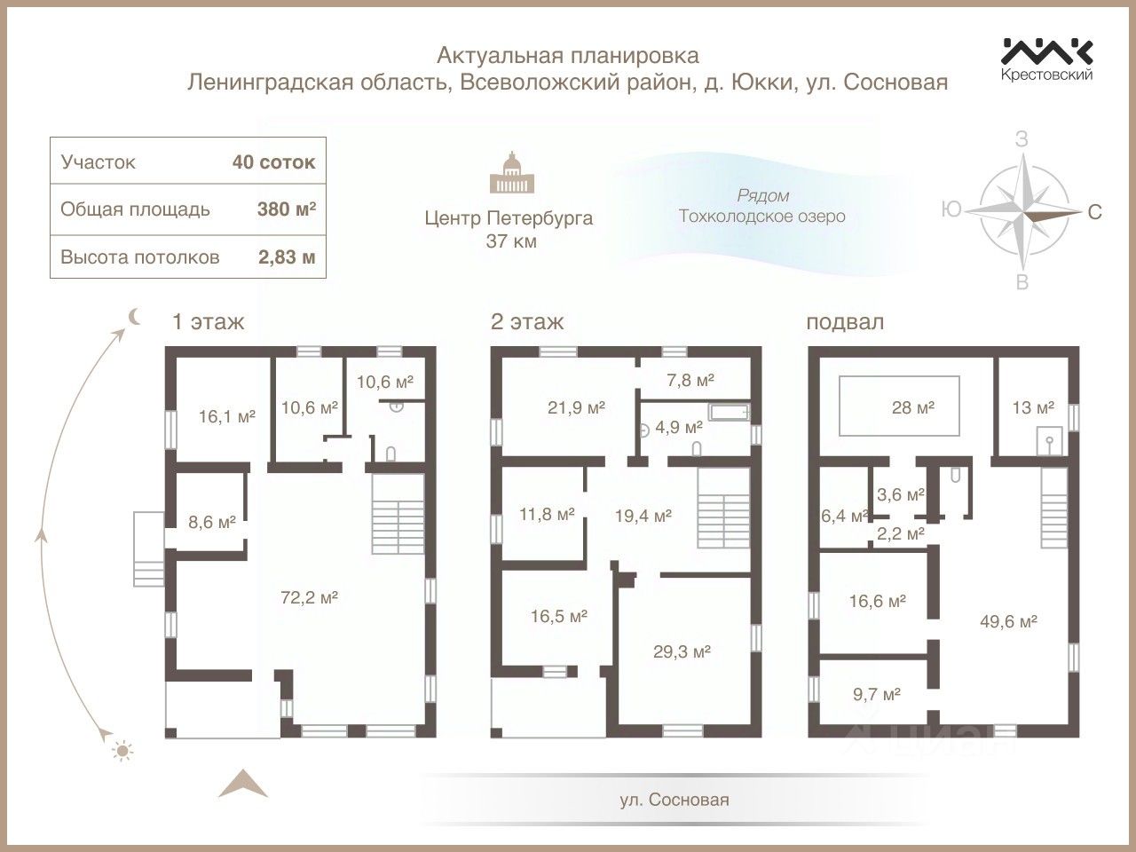 Коттедж площадью 380 м² (450 м²) расположен на живописном участке 40 соток (возможно увеличение до 46 соток) в наиболее привлекательном районе д. Юкки. Дом построен из качественных материалов: фасад — финский кирпич TERCA, кровля — гибкая черепица KATEPAL, окна VEKA, монолитная плита фундамента 50 см.