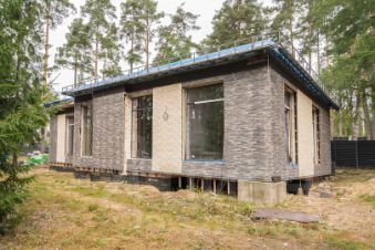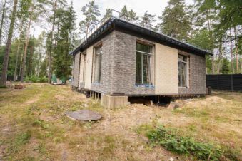 Основной монолитный дом в стиле хайтек включает первый этаж 152 м² и цокольный 135 м². Построен без экономии на материалах: монолит с заполнением из газобетона, облицовка камнем, все окна установлены.