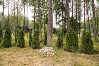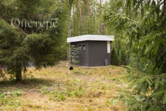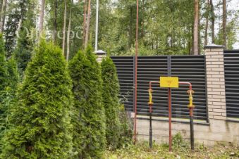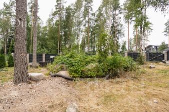 Участок 20 соток расположен вторым от дороги в окружении деревьев и черничника, полностью огорожен забором с откатными воротами 8 метров. Удачное расположение рядом с КПП обеспечивает быстрый выезд из посёлка.