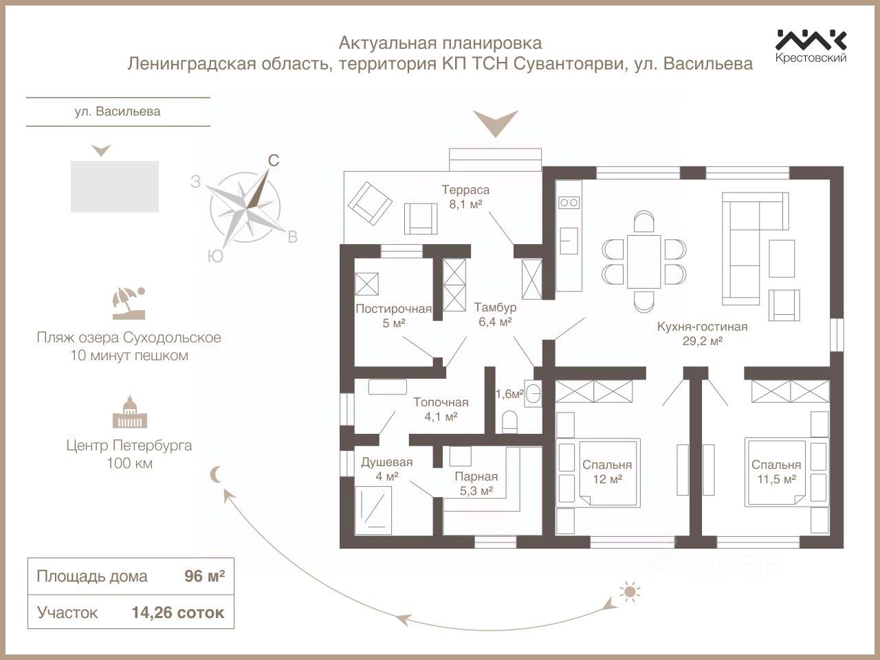 Площадь участка — 14 соток. Деревянный коттедж площадью 96 м² с современным ремонтом полностью готов к круглогодичному проживанию. Две уютные спальни создают идеальные условия для отдыха и уединения, а просторная кухня-гостиная станет сердцем дома для тёплых семейных вечеров.
