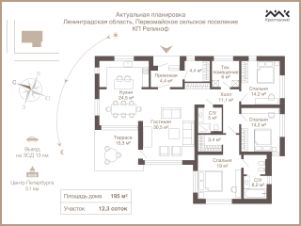 Планировка включает три спальни, зонированные кухню, гостиную и столовую. На жилом чердаке 25 м² можно организовать личное пространство для хобби или отдыха. А терраса из лиственницы площадью 50 м² — идеальное место для отдыха на свежем воздухе.