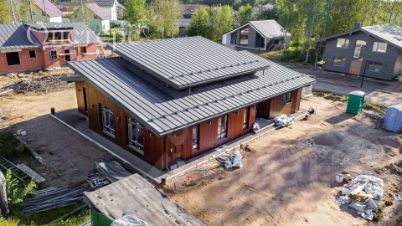 Он построен из газобетона 400 мм с внешним утеплением 50 мм. Фасадная отделка выполнена из лиственницы, пропитанной маслом Biofa, что обеспечивает долговечность и естественную красоту материала. Предусмотрена возможность размещения сауны и гардеробных.