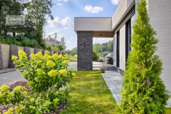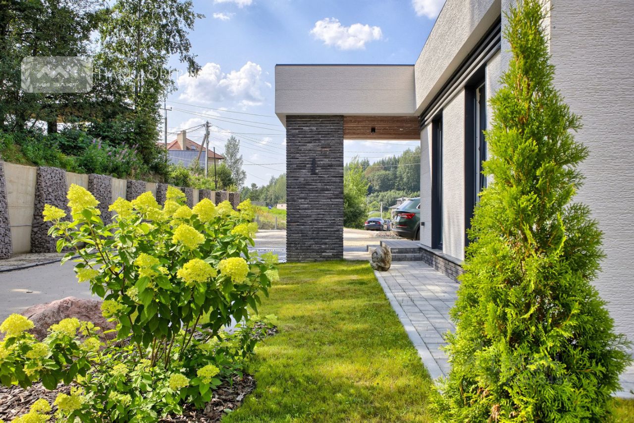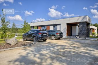 Прочная металлическая двускатная кровля (угол наклона 5) гарантирует эффективную защиту от дождя и неблагоприятных погодных условий. Для облицовки фасада применены качественные японские фиброцементные панели и планкен, придающие зданию современный и респектабельный вид.