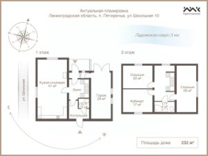 Общая площадь участка 20 соток, а дома 232 м². Он включает два этажа и просторный подвал, построен из надёжного кирпича.