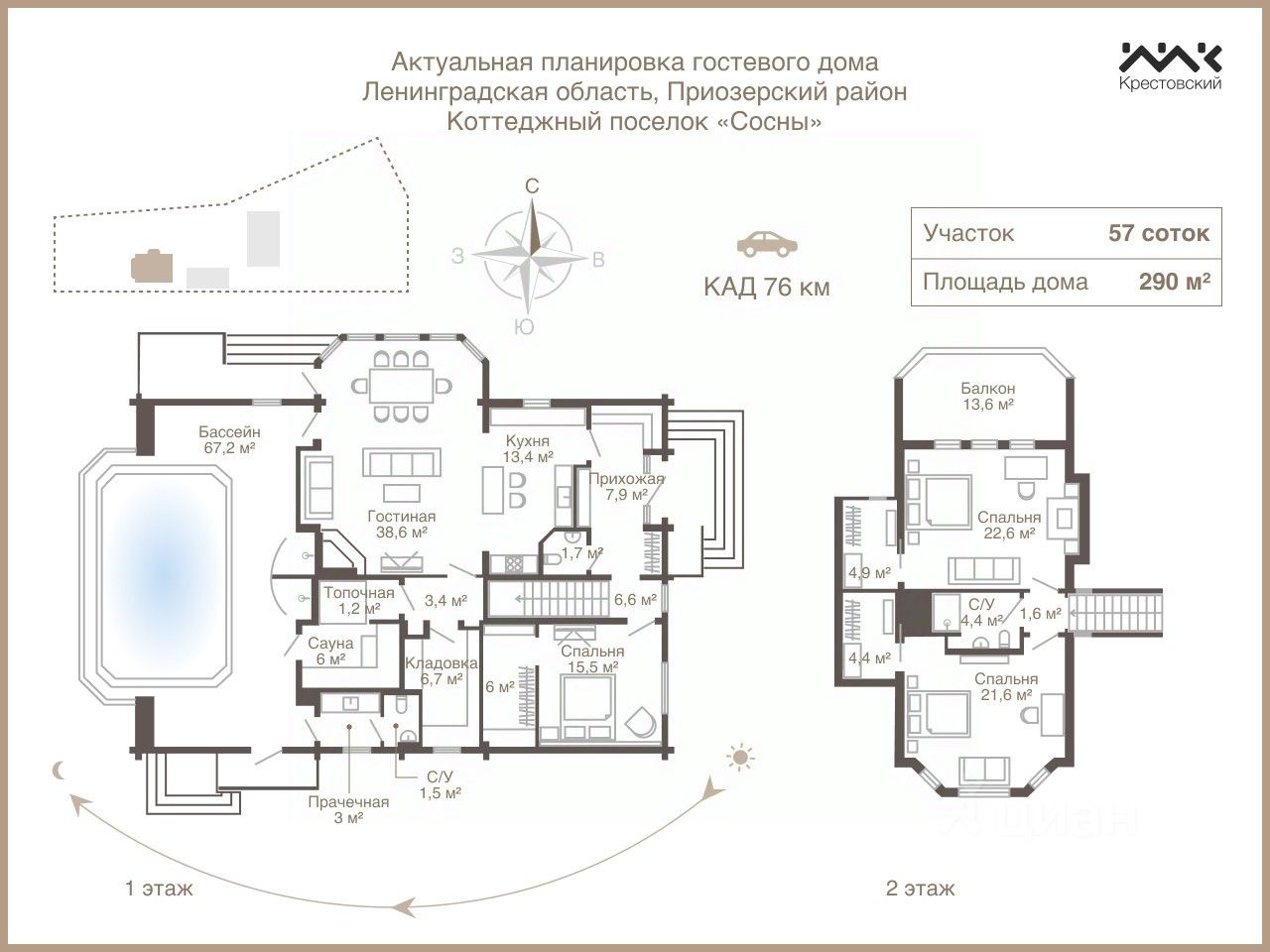 Загородное поместье площадью 58 соток находятся в закрытом охраняемом посёлке "Сосны", на первой линии Суходольского озера. Участок сухой, с удобным заездом и продуманным зонированием.