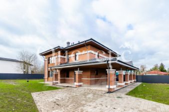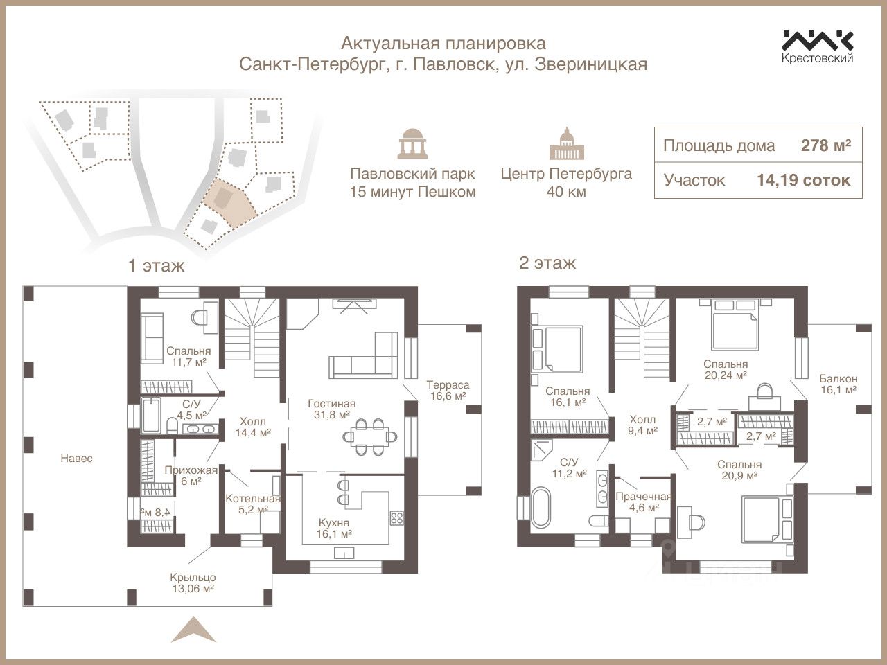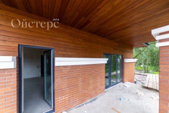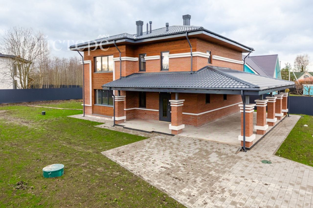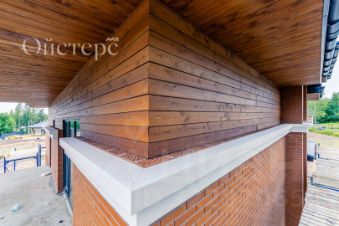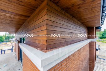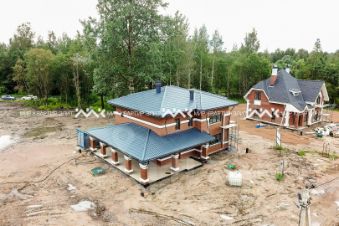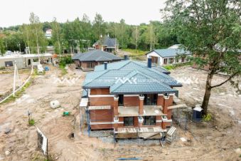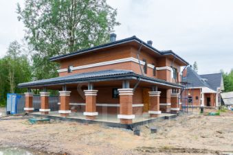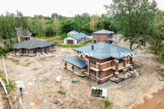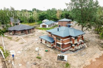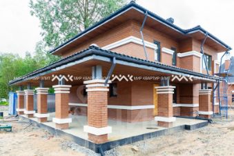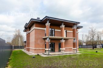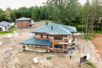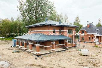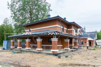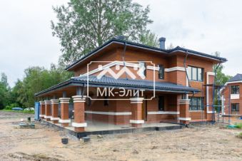 Дом находится на участке 14,18 соток и построен из высококачественного газобетона 375 мм на монолитной плите 300 мм. Жилая площадь 184,45 м² дополнена террасой 21,89 м² и крыльцом 6,07 м². Фасад выполнен из облицовочного кирпича и планкена под вальмовой крышей с металлочерепицей.