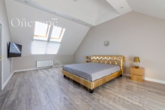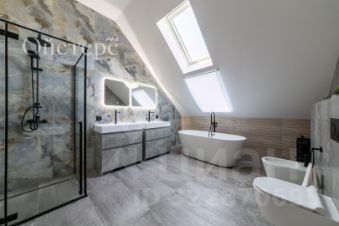 - на втором этаже под крышей находятся мастер-спальня (+ванная комната) и две детских комнаты (+ отдельная ванная). В скатах крыши выполнены мансардные окна, атмосфера очень уютная и камерная.
