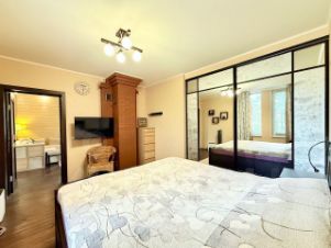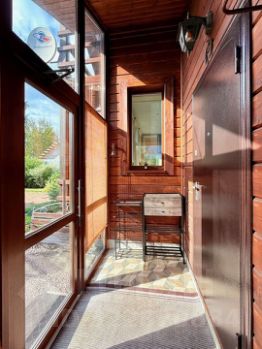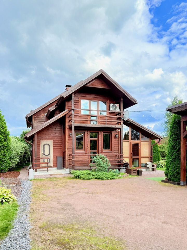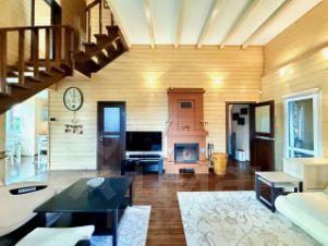 - первый этаж просторная прихожая с застекленным крыльцом, кухня квадратной формы 16.2 м2 с выходом на балкон, гостиная со вторым светом и камином 25.2 м2 (высота потолков 3.83 м), спальня 15.8 м2 16 м2, большой совмещенный С/У 8 м2 с естественным освещением, застекленная лоджия с выходом на участок;