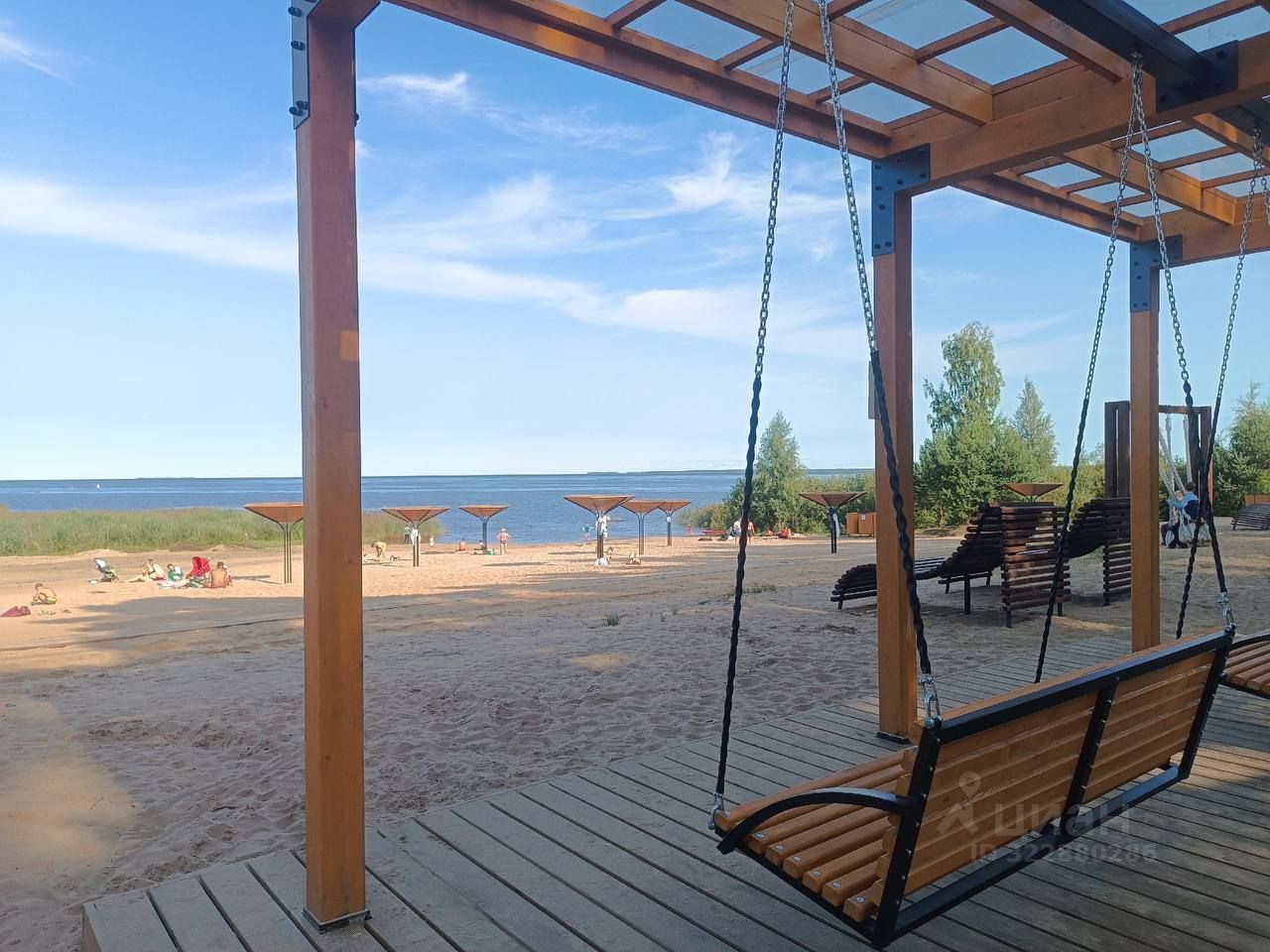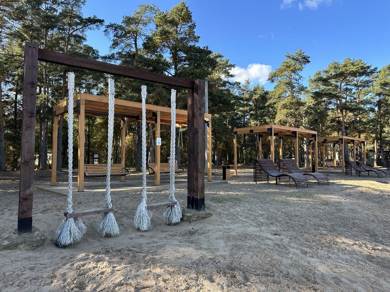 В этом году на берегу обустроена новая курортная зона, песочный пляж в окружении сосен.