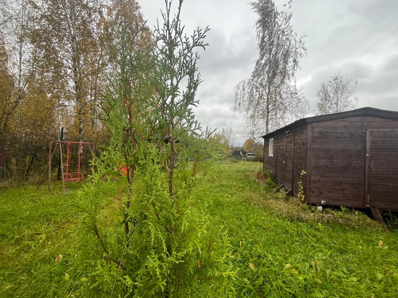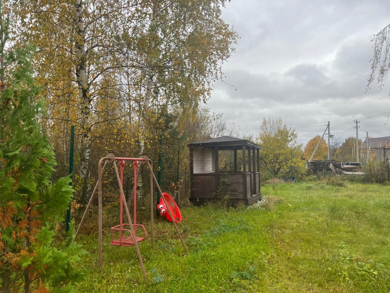Сам участок правильной формы, частично разработан и огорожен сеткой-рабицей. На территории высажены сосны и туи, есть беседка и бытовка, к которой подключен свет.